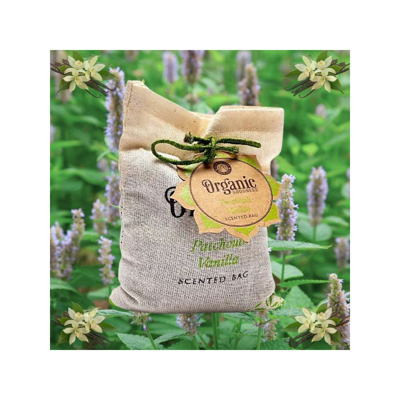 Sachet en coton rempli d'herbes, de poudre minérale et d'huiles essentielles, parfait pour rafraîchir un petit espace et éliminer les mauvaises odeurs.
